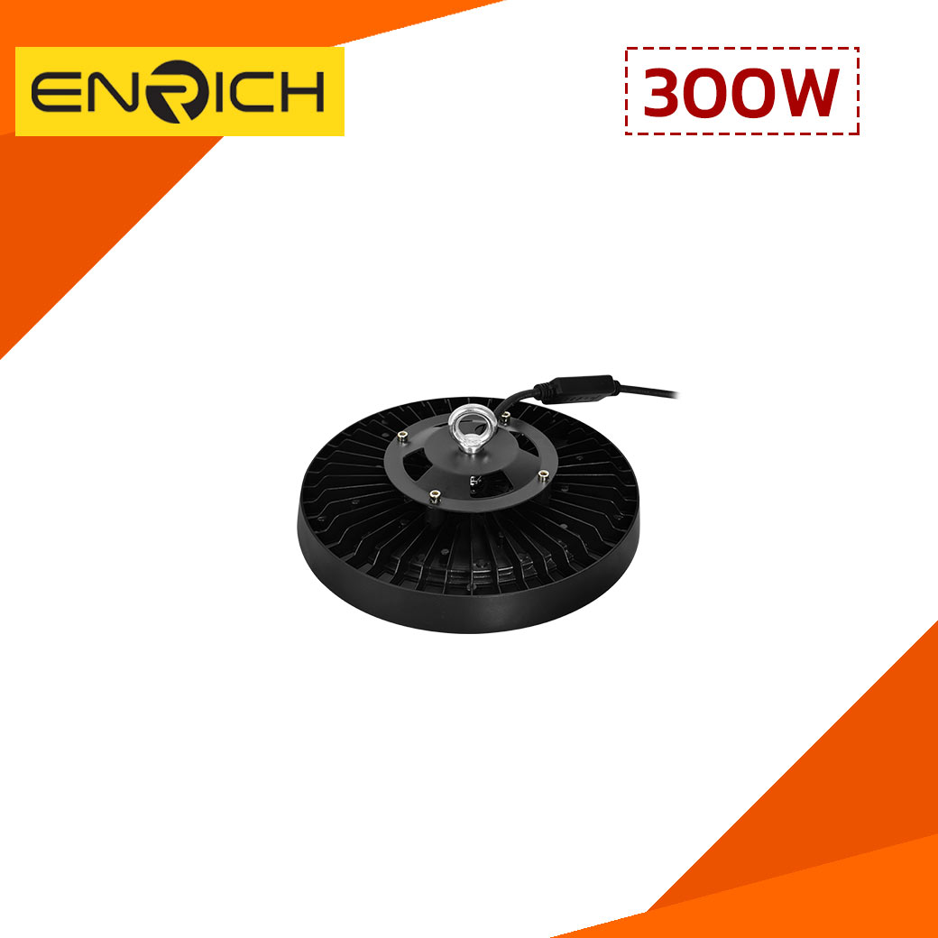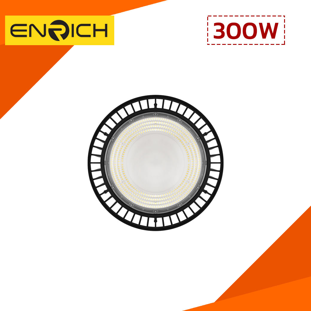 โคมไฮเบย์ LED 300W ENRICH UFO รุ่น AIR SURGE ถูกออกแบบมาเพื่อรองรับการใช้งานในโรงงานอุตสาหกรรมและคลังสินค้า โดยมุ่งเน้นความประหยัดพลังงานและประสิทธิภาพสูง เช่น สนามกีฬาในร่ม หรือ ศูนย์ประชุม เนื่องจากมีคุณสมบัติที่โดดเด่น ใช้วัสดุอลูมิเนียมคุณภาพสูง มาพร้อมกับตัวกันไฟกระชาก ถึง 2 ชั้น (Internal 4kV + External 6kV) ช่วยเพิ่มความปลอดภัยและยืดอายุการใช้งานของตัวโคมให้ยาวนานถึง 30,000 ชั่วโมง พร้อมด้วยค่าความสว่างสูงสุดถึง 100 ลูเมน/วัตต์ เหมาะอย่างยิ่งสำหรับพื้นที่ที่ต้องการแสงสว่างอย่างเต็มประสิทธิภาพ เช่น โรงงาน คลังสินค้า ห้างสรรพสินค้า หรือศูนย์กีฬา