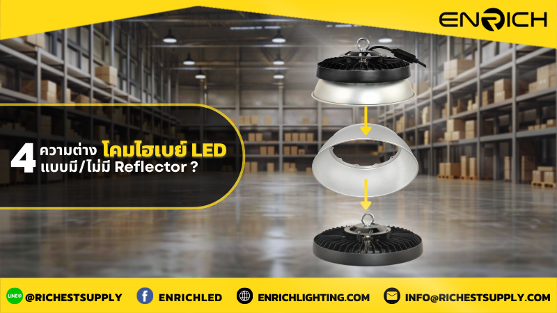 โคมไฮเบย์แบบไหน? มี Reflector หรือไม่มีดี เมื่อพูดถึงโคมไฟไฮเบย์ ไม่ว่าจะใช้ในคลังสินค้า โรงงาน หรืออาคารขนาดใหญ่ หนึ่งในปัจจัยที่ควรพิจารณาคือ “จะเลือกใช้แบบมี Reflector หรือไม่มีดี?” เพราะถึงแม้ทั้งสองแบบจะให้แสงสว่างได้เหมือนกัน แต่รายละเอียดของลำแสง การกระจายแสง และความเหมาะสมกับลักษณะพื้นที่กลับแตกต่างกันชัดเจน บทความนี้จะช่วยอธิบายความแตกต่างระหว่างโคมทั้งสอง เพื่อให้สามารถเลือกใช้งานได้เหมาะสมกับลักษณะของพื้นที่ 1.การกระจายแสงและรูปแบบของลำแสง โคมไฟไฮเบย์แบบมี Reflector จะมีชิ้นส่วนสะท้อนแสงครอบรอบแหล่งกำเนิดแสง ทำหน้าที่ควบคุมทิศทางของแสงให้โฟกัสลงด้านล่างอย่างแม่นยำ ทำให้เกิดลำแสงที่แคบและพุ่งตรง ซึ่งเหมาะสำหรับพื้นที่ที่ต้องการแสงเข้มเฉพาะจุดหรือในกรณีที่ติดตั้งบนเพดานที่สูงมาก เช่น คลังสินค้า, โกดังโลจิสติกส์ หรือโรงงานที่ต้องการความสว่างเฉพาะพื้นที่ทำงาน โคมแบบไม่มี Reflector หรือที่เรียกว่าโคมไฮเบย์ UFO จะปล่อยแสงออกในลักษณะที่กระจายกว้าง ลำแสงแผ่ออกโดยรอบครอบคลุมพื้นที่ในมุมกว้าง จึงเหมาะสำหรับพื้นที่ที่ต้องการแสงสว่างทั่วถึง ไม่เน้นการโฟกัสเป็นจุด เช่น พื้นที่โล่งขนาดกลาง หรือโรงงานที่เพดานไม่สูงมาก 2.การควบคุมแสงและผลกระทบต่อสายตา โคมไฟแบบมี Reflector ช่วยลดแสงแยงตา (glare) ได้ดี เนื่องจากแสงถูกควบคุมให้พุ่งตรง ไม่กระจายออกด้านข้างมากนัก จึงให้ความรู้สึกสบายตามากกว่าเมื่อมองบริเวณรอบโคม เหมาะสำหรับสถานที่ที่มีคนทำงานอยู่ใต้โคมโดยตรงเป็นเวลานาน โคมแบบไม่มี Reflector อาจเกิดปัญหาแสงกระจายเข้าตาได้ง่ายกว่า โดยเฉพาะในพื้นที่ที่มีเพดานต่ำ […]
